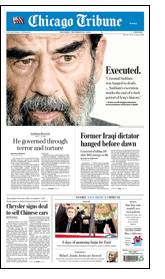 " Remarkably, the Chicago Tribune brought elegance to what is truly a gruesome story about a terrible human being. The large image contrasted with the understated, diminutive, one-word headline surrounded by white space – no other paper whispered the headline. But sometimes a whisper is the best way to get someone's attention. Generous use of white space framed the elements of the Hussein package. Unlike some 6-column solutions, this one had a much tighter crop for more impact and used the space surrounding the image for placement of the headline."