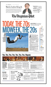 The Pilot provided a child's perspective on Martin Luther King – an inspired and unique solution. The weather package combined a headline that cut to the heart of the matter, an energetic photo and an informational graphic that served up the forecast. Then the Pilot turned a boring meeting photo into must-see V-P with a very clever, but telling, headline.