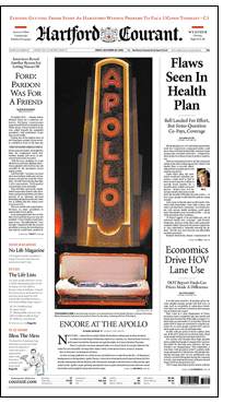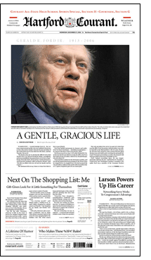 Hartford's front pages failed to meet the minimum requirement for single-copy presentation: placing the lead headline above the fold. For instance, the main headline for the Gerald Ford page fell beneath the fold. So did the image of James Brown. One could argue that everyone already knew that both had died. And that Hartford probably has no more 15% single-copy sales. And that single-copy sales are rarely impulse buys.